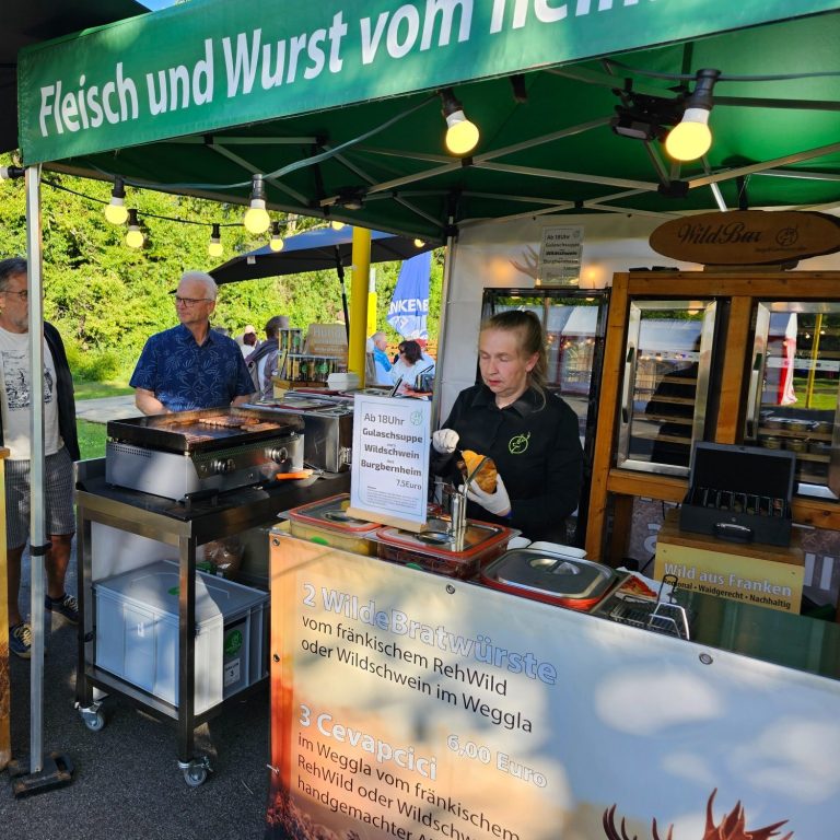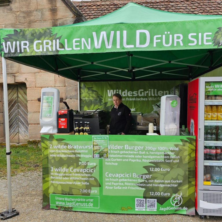 Wir bieten Ihnen auch hier Bratwürste und Burger vom fränkischem Wild. Ob Rehwild oder Schwarzwild, es wird Ihnen schmecken, unser Wort drauf.